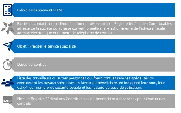 En outre, l'article 14 de la Loi Fédérale sur le Travail, ainsi que l'article 15-A de la Loi sur la Sécurité Sociale et l'article 29-Bis de la Loi INFONAVIT, tels que modifiés par le Décret, prévoient une responsabilité conjointe et solidaire du bénéficiaire avec le prestataire en ce qui concerne les travailleurs utilisés pour exécuter la prestation de services spécialisés, au cas où le prestataire ne respecterait pas les obligations en matière de sécurité sociale. Pour les raisons susmentionnées et sur la base des dispositions de la Loi sur l'Impôt sur le Revenu et du Code Fédéral des Impôts, le bénéficiaire doit demander les documents suivants au prestataire aux fins de la déduction et du crédit de l'ISR et de la TVA ainsi que pour éviter toute responsabilité solidaire : • Inscription à l'IMSS ou modifications les plus récentes des salaires des travailleurs mis à disposition • Format mensuel et bimestriel des cotisations ouvrières-employeurs avec la répartition de tous les salariés • Format SIPARE avec preuve de paiement • Avis de conformité en matière d'INFONAVIT • Avis de conformité en matière de sécurité sociale • Avis de conformité émis par le SAT • CFDI des paiements des salaires des employés • Déclaration fiscale mensuelle avec preuve de paiement Les documents mentionnés ci-dessus sont considérés comme des informations confidentielles du prestataire de services et contiennent des données des employés. Par conséquent, le bénéficiaire doit les sauvegarder avec les normes de protection les plus élevées. Par conséquent, le prestataire de services peut demander la signature d'un accord de confidentialité, ou le contrat de prestation de services spécialisés peut inclure une clause de confidentialité.